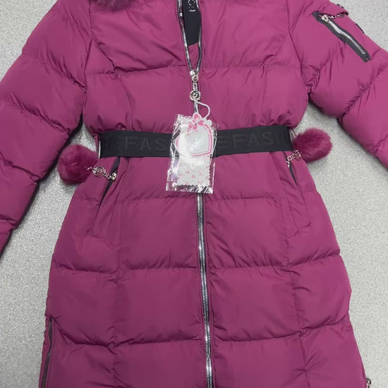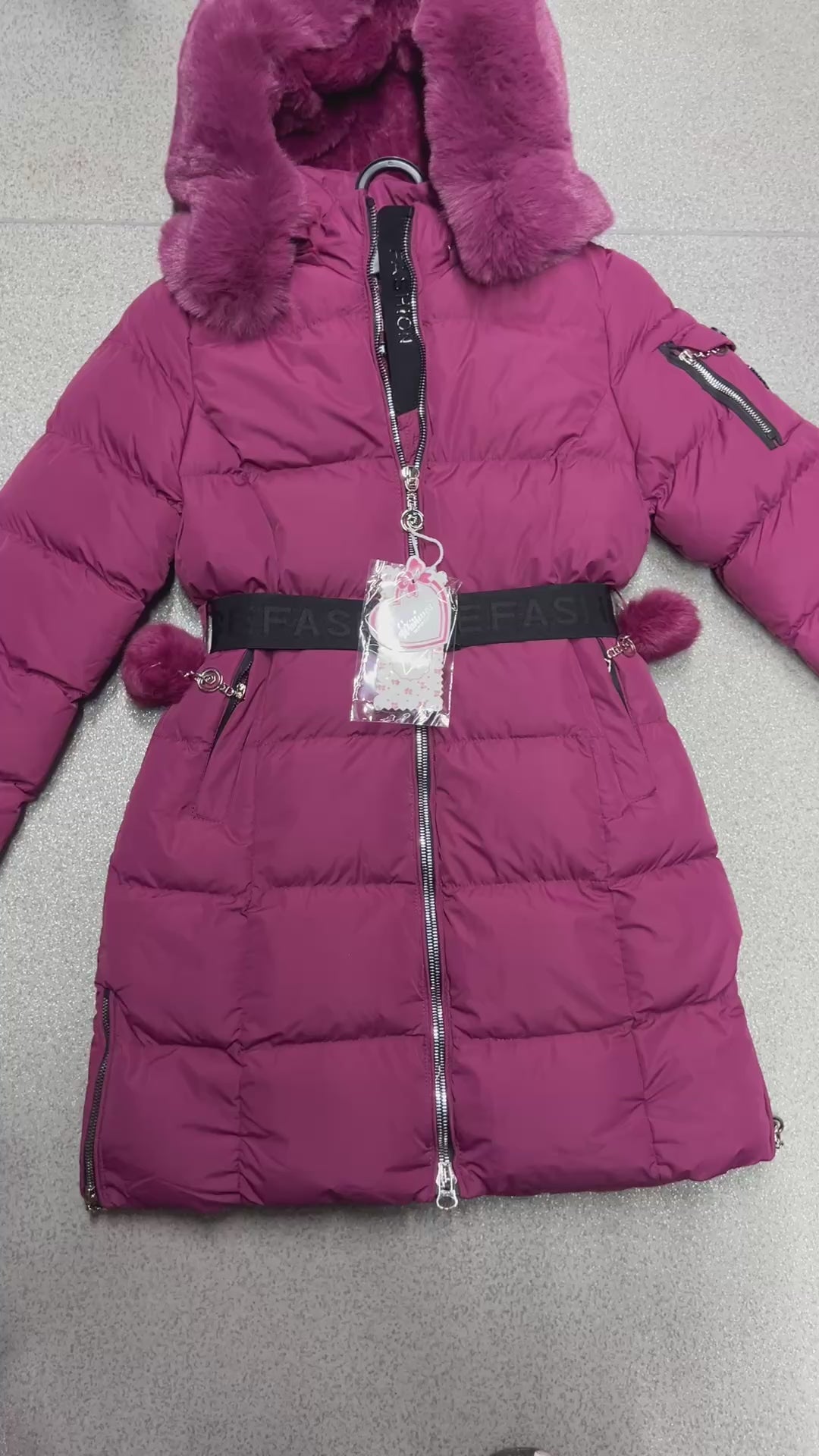 Geaca este îmblănită, are glugă detașabilă și centura în talie.